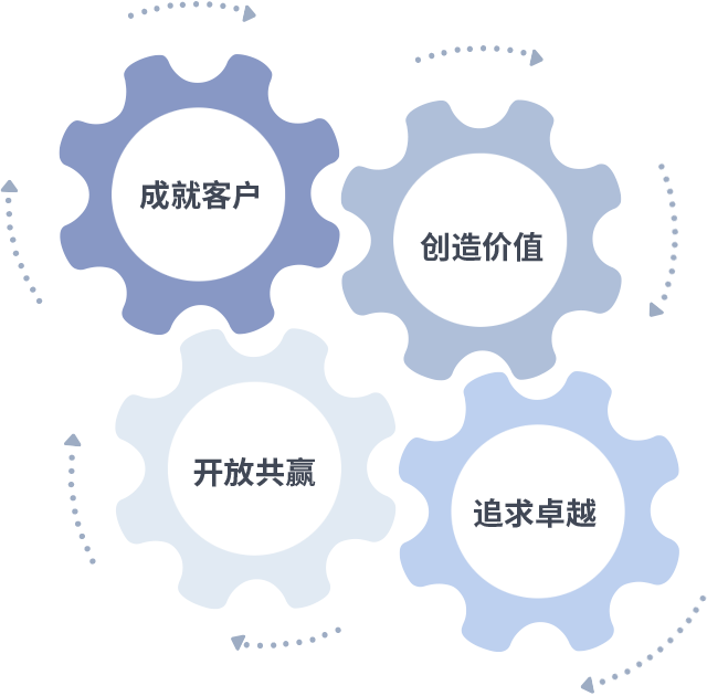 成就客户是一切决策的出发点,创造价值是衡量所有工作的标准,追求卓越是918搏天堂做事做人的态度,开放共赢是918搏天堂的格局也是最终的结果。价值观的齿轮环环相扣,推动着组织里的每个人不断向前。